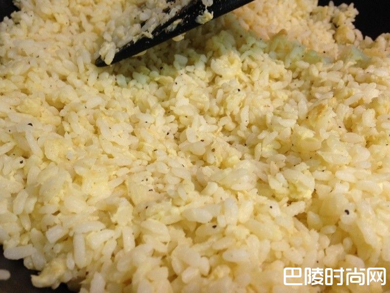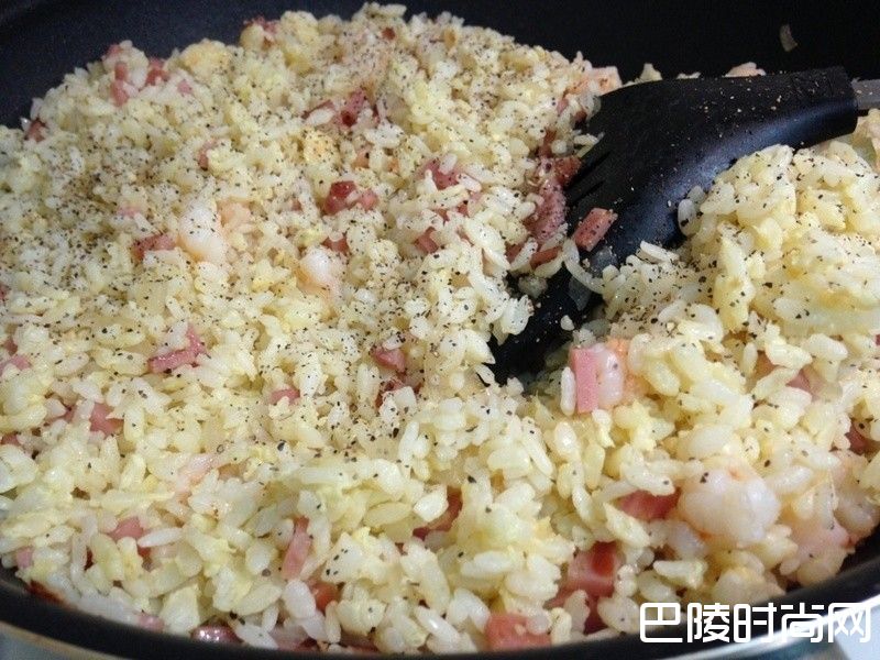 5再将炒好的黄金炒饭倒入加上适量的黑胡椒一起拌炒。