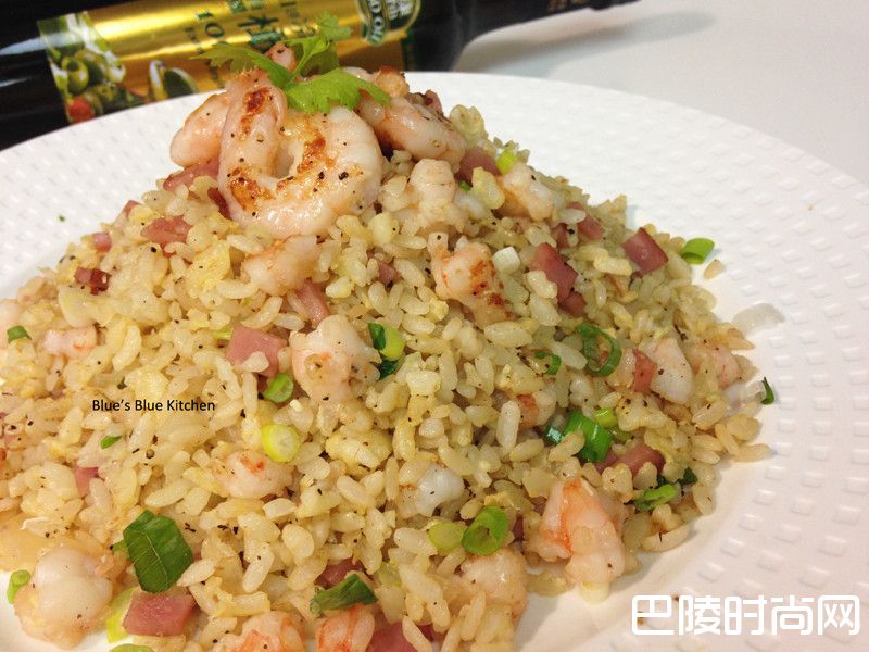 31大匙橄榄油热锅后,将步骤1的饭全部倒入,快速翻炒后盛起。(炒的过程中最好能让米饭维持在翻动状态,这样炒出来才会粒状分明松散不结块)