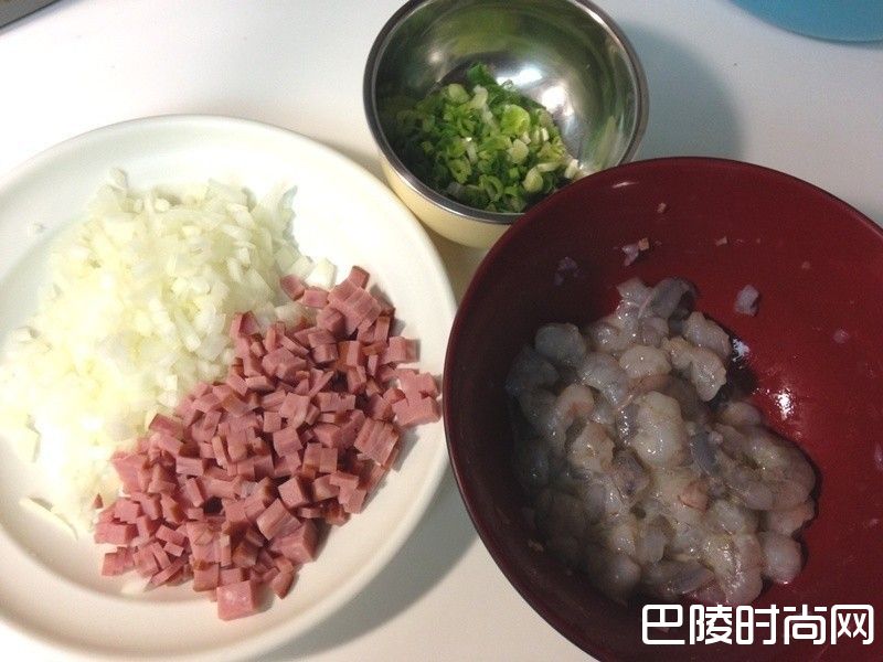 2洋葱切末,火腿切小丁、虾仁去肠泥后切小丁并加入醃料抓匀备用。虾仁可留2~3个不切最后煎熟盛盘装饰用。