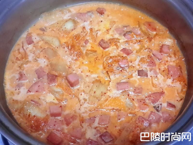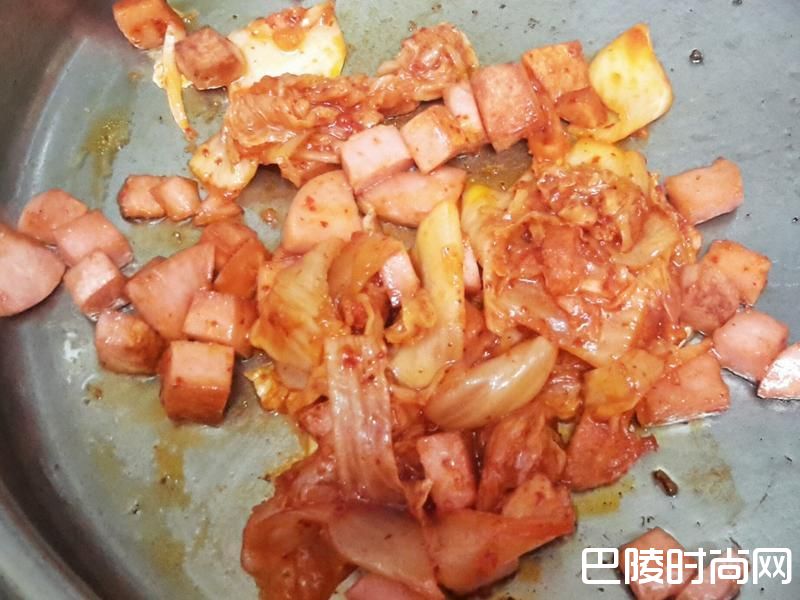 2热锅下油,先炒洋葱,然后下火腿炒一分钟,再加泡菜