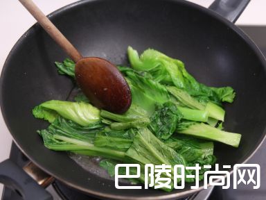 8把芥菜及少许水加入平底锅内,煮大约两分钟至芥菜软身,加入盐及糖调味,上碟