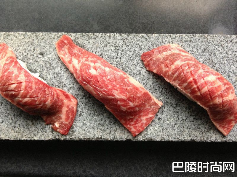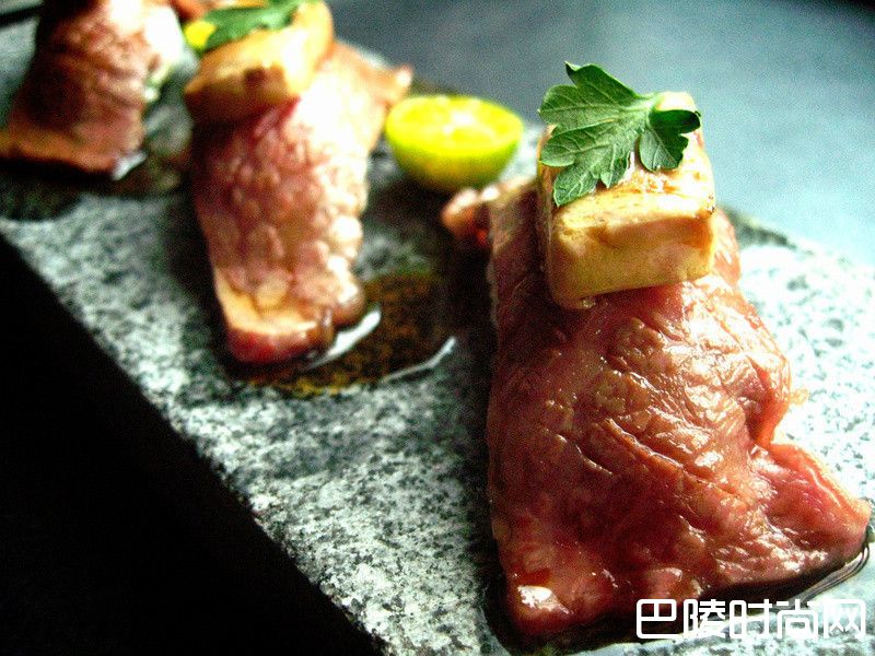 5将醋饭捏成适当大小,放上牛小排肉片(可用尖刀在表面逆着肌理多划几刀)与鹅肝,以火枪炙烧至上色即可