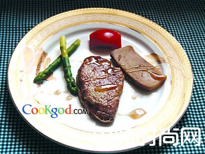 脆皮法国鹅肝配珍菌法国鹅肝100克,罐头白灵菇30克,芦笋尖20克,西红柿10克。调料日本烧汁10克,鲜味汁5克,蒜蓉2克,日本酱油5克,干葱蓉5克,糯米粉15克,牛油30克,湿淀粉0.5克。