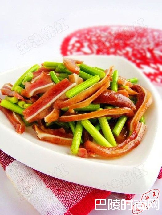 做法1.蒜苔切断,猪耳朵切丝,葱切葱花,姜切末,蒜切片