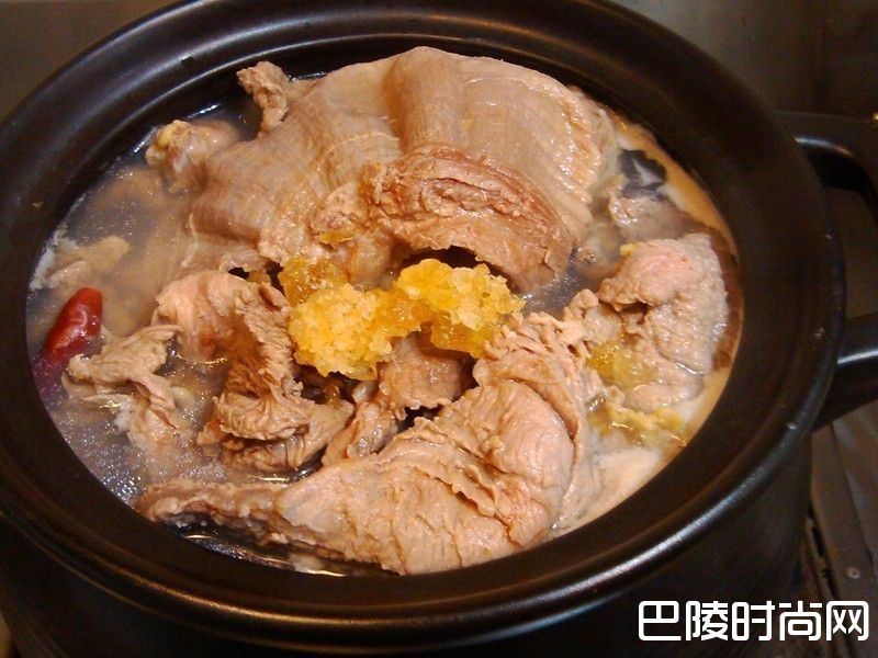 7盖上锅盖熬煮1.5H之后,再烫一把青江菜淋上牛油,就可以准备上桌了。