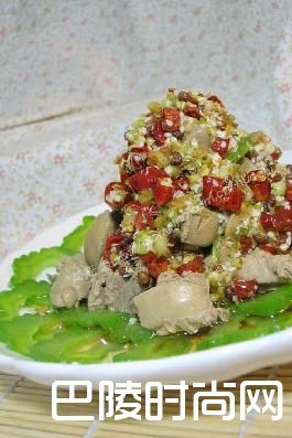 苦瓜拌鸡肝苦瓜适量,鸡干适量