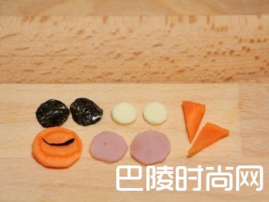 8之后用海苔,火腿,红萝卜和芝士准备小鸡的脸(图片所示)