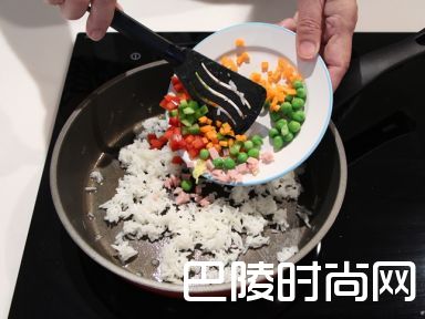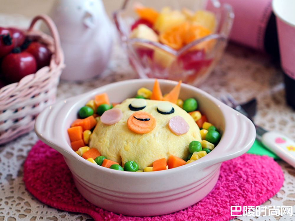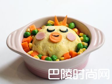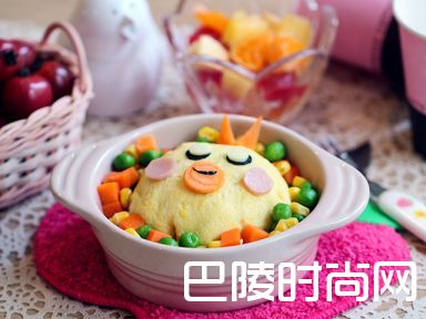 9将炒好的混合蔬菜放在饭团周围,按照图示摆好小鸡的脸