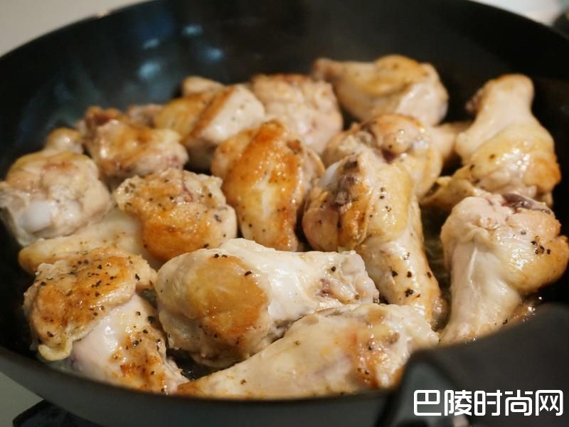 1小鸡腿用少许黑胡椒(分量外)抓匀后放入加了适量油热的平底锅,中小火慢煎。 (皮较多的那一面先下锅盖上锅盖煎到金黄微焦((约5分钟),翻面也是再煎5分钟。