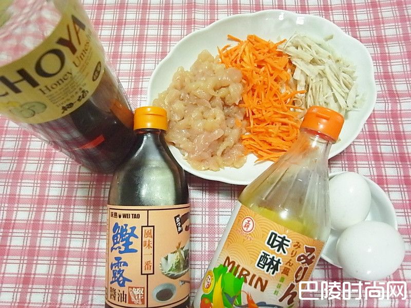 1鸡肉切碎,红萝卜和牛蒡刨丝