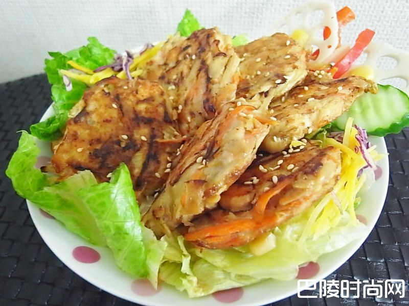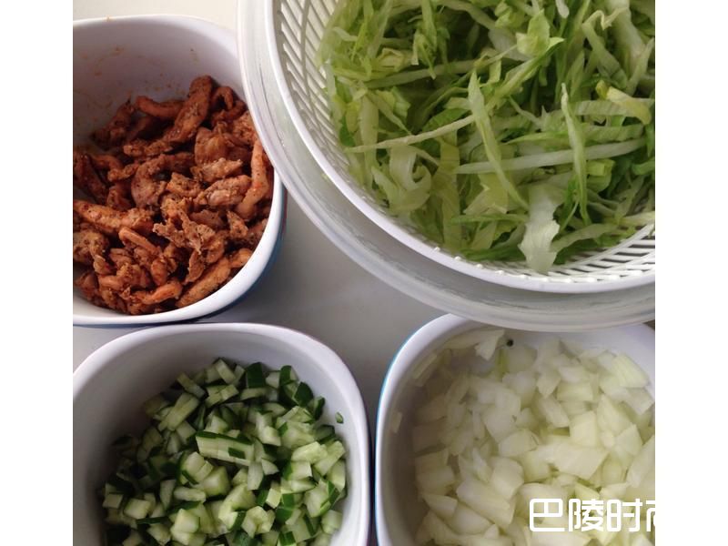 1鸡腿肉切丝,用黑胡椒粒和烧烤粉醃15分钟,烤箱200°c、10-15分钟,需2面翻烤,美生菜切丝,小黄瓜、洋葱切丁。