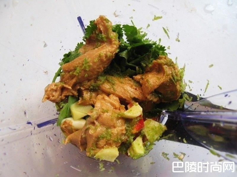 中的香菜、辣椒、蒜瓣、姜片和花生酱放进打汁机。用刨刀把一颗莱姆皮磨入果汁机中并挤入半颗莱姆汁,果汁机中加少许水盖上盖子把所有材料