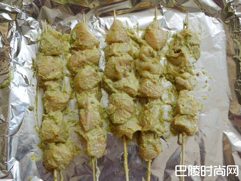 4取一烤盘,包上锡箔纸,放上串好的鸡肉串,将剩下一半的沙嗲酱倒在鸡肉串上,用手将沙嗲酱抹在鸡肉串上并按摩均匀(可依各人口味加些盐和橄榄油调味,我都没加也好吃),将烤盘放入烤箱中先烤8~10分钟