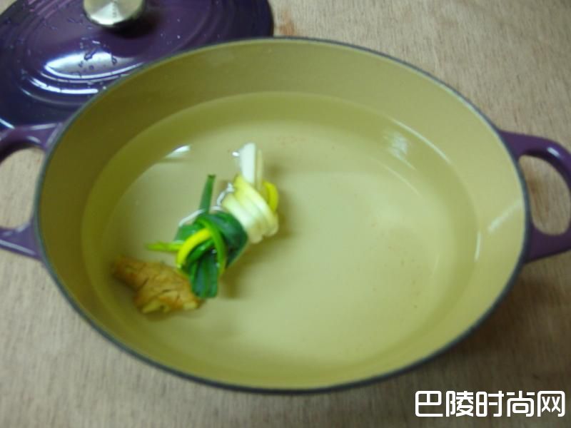 3铸铁锅加入1/2的水,放入一块姜(稍微拍一下)、葱(2~3根卷成一卷)、一碗米酒(吃饭的碗)和二匙盐,盖上锅上,放到炉子上煮滚。