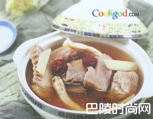 2、净锅上火,放入清水、姜片、老鸭、当归、红枣,大火烧开转小火炖50分钟调味即成。