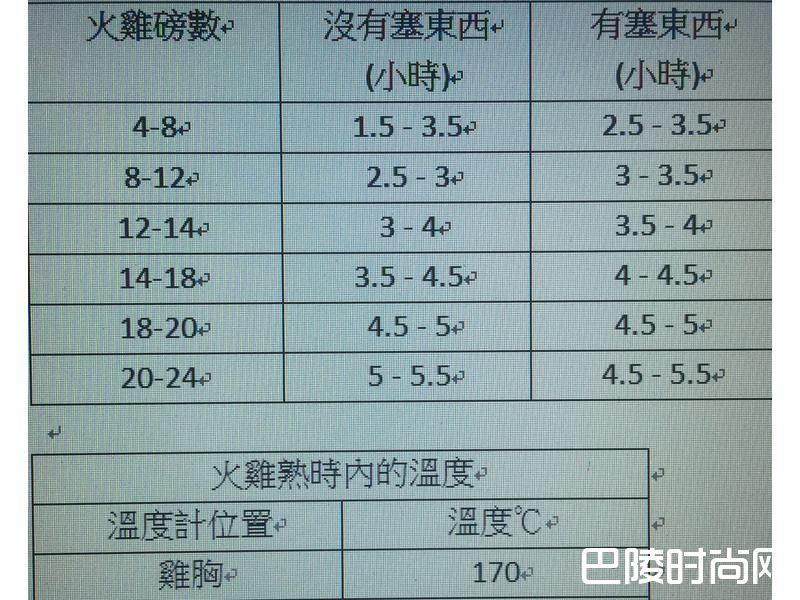 5火鸡肚子是否有塞东西烤熟时间 &火鸡熟时内的温度(表格只提供参考用)