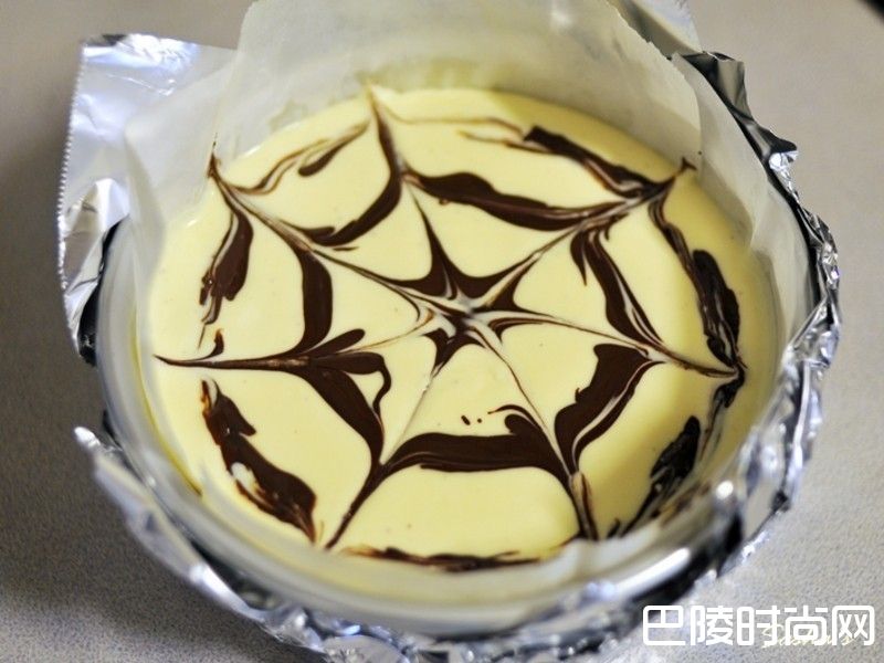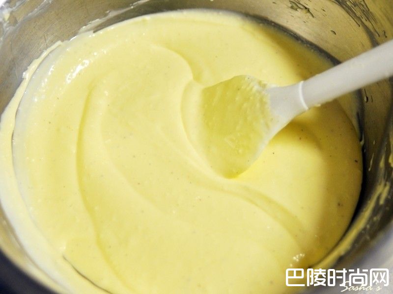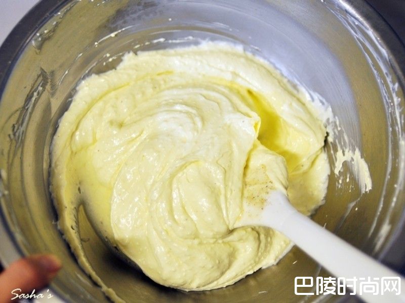 3蛋、香草精、鲜奶油轻轻打匀,避免打入过多的气泡,再与起司糊用刮勺搅拌均匀,倒入模中稍微抖一抖,让表面平整即可。
