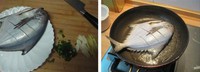 2、热锅多倒点油,6成热时把鱼放进去油炸(如果是清油就要等油泡散了,把火关小点才能把鱼放进去)炸至两面要发黄时捞出,放进盘子里。