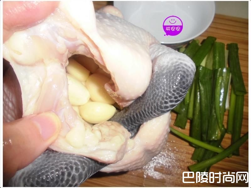 6[全鸡处理]全鸡一只洗干净,安安将鸡翅膀、鸡爪如相片所见折起。蒜头剥皮备用。葱切段备用。干香菇洗净备用。