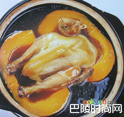2、童子鸡焯水、洗净,放入南瓜中,倒入清水,放忽、姜烧沸后放入绍酒,煲半小时左右,用精盐、味精、鸡精调味即可上桌。
