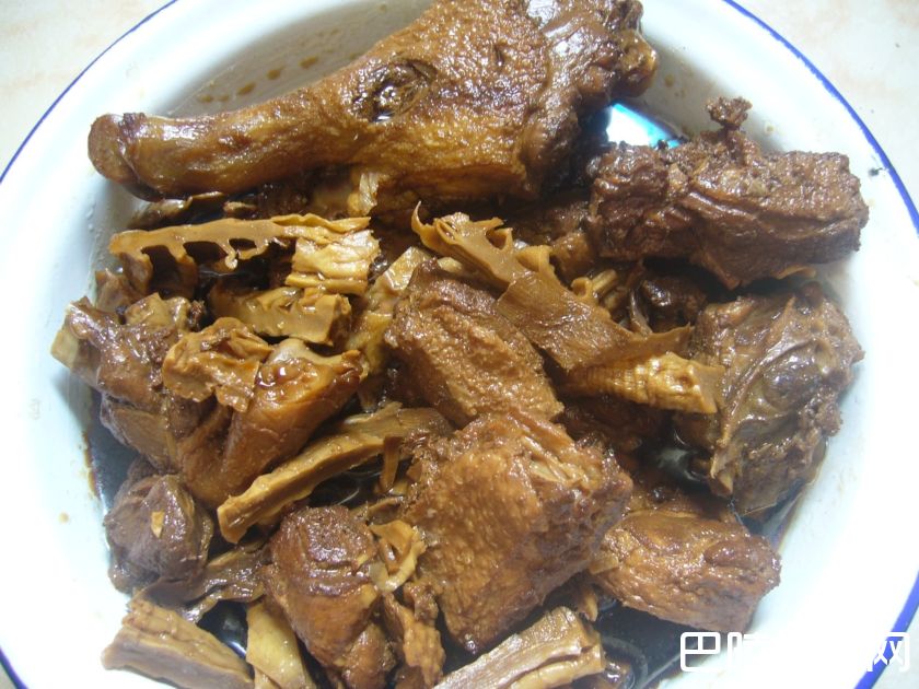 7、这个时候鸭肉虽然已经熟了,但是不够离骨。加些料酒和盐焖煮15分钟,焖煮过程中注意不要把水烧干了,可以继续添加料酒或者水。