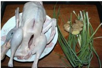 2.油锅烧热,倒入生姜片,爆香;加入鸭块,不停翻炒五分钟,至肉色略显金黄颜色。