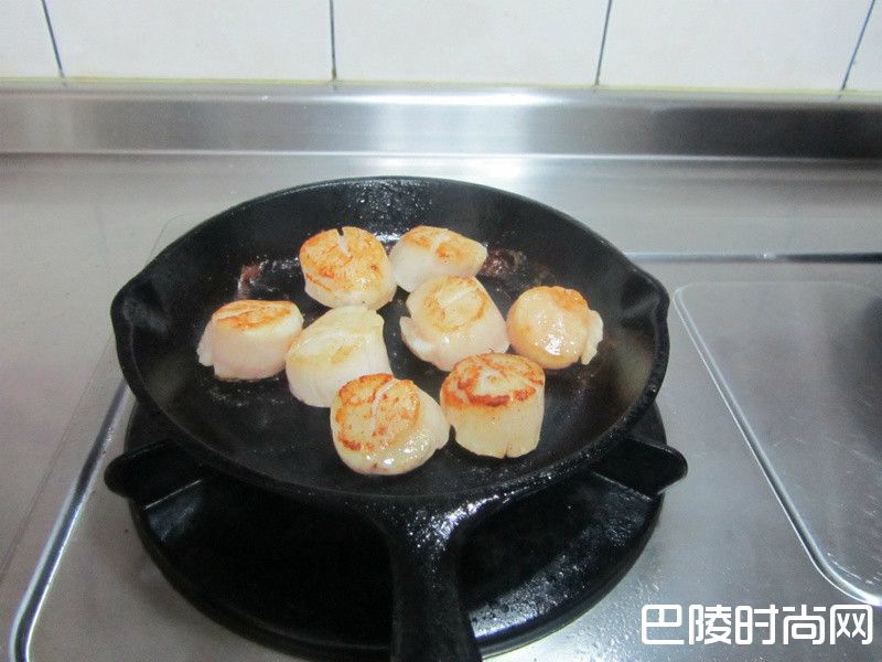3步骤3干贝冷藏解冻 放入烧的极热加上油的热锅中两面都封住 淋上白兰地烧一下 半熟即可