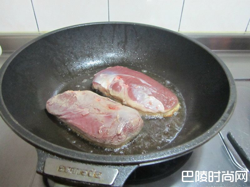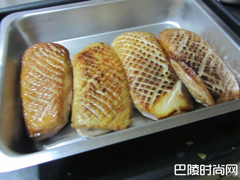 1步骤1 在半冻状态下 将鸭胸修整齐 在皮面上划上交叉菱纹 深度只要皮层一半深即可 冷藏完全解冻取出已少许盐.胡椒调味 皮面放入已烧热的干锅煎 两面都需煎过