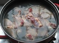 11.取出野鸭,捞去姜、葱,撇去浮沫,野鸭去除胸骨和锁喉骨;