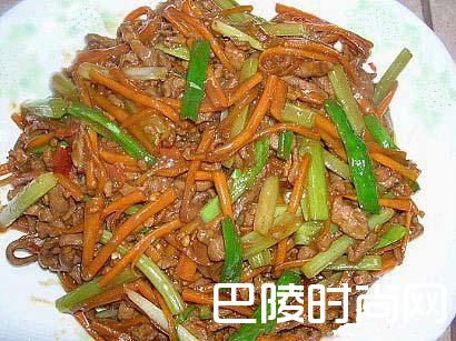 炒野鸡红主料:瘦猪肉三两,切丝;胡萝卜三两切丝;蒜苗一两,切段;芹菜二两,切段;豆瓣一大匙,酱油三大匙,醋一咖啡匙,花椒粉,盐,鸡精适量,淀粉两大匙。