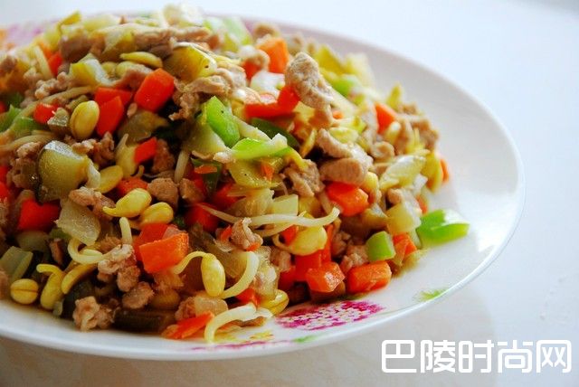 2、汤渐渐地少了之后,加入黄豆芽,胡萝卜丁,再次翻炒,焖一会,最后,放入咸黄瓜,绿辣椒,翻炒几下出锅;