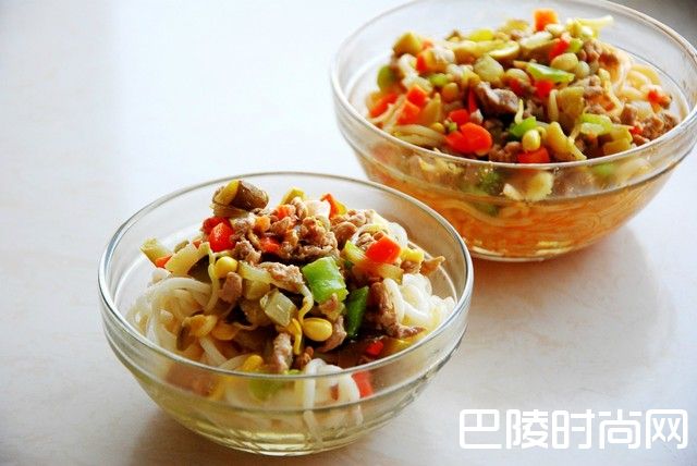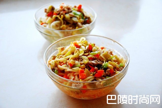 4、面条就是过水面条。先烧水煮熟,期间,可以倒入几次冷水,熟了之后,用漏盆过滤水,冲凉。防止粘连,往里面搅拌入香油,我能吃辣的,所以,吃的时候放了一些麻辣油;