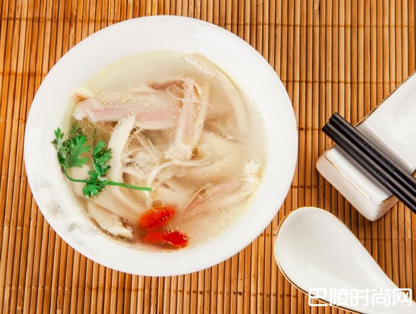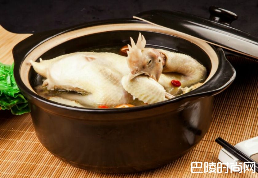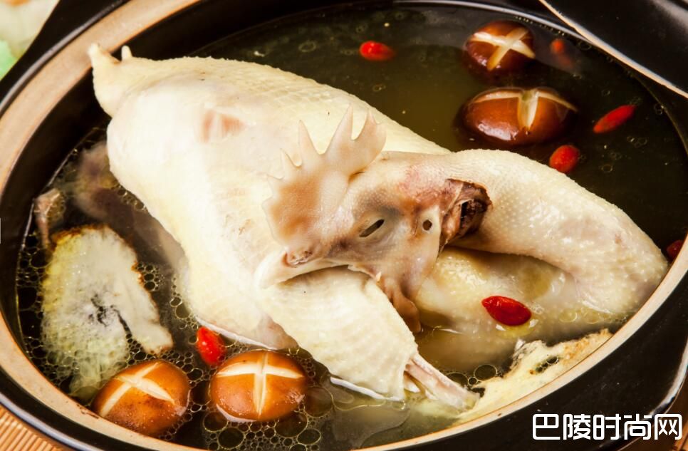5、先置旺火上烧沸、加绍酒、撇去浮沫,再移至微火炖约2小时,取去火腿、脚爪、竹箅、葱姜,加入精盐,烧至微沸,离火即成。