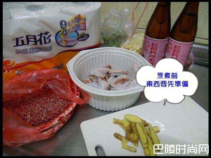 1准备鸡肉切块、鸭血、姜片切片、米酒1瓶半、香菇