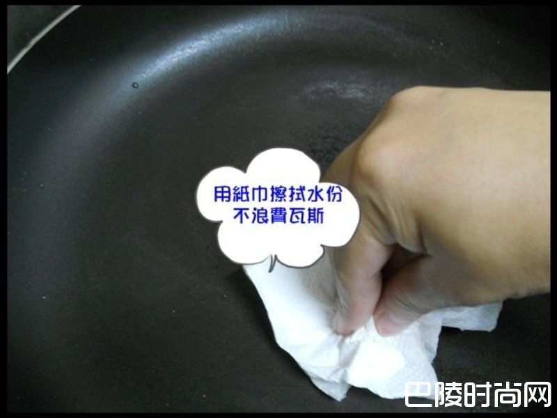 2先用纸巾擦锅底水分,锅子比较不会太热,也不会浪费瓦斯