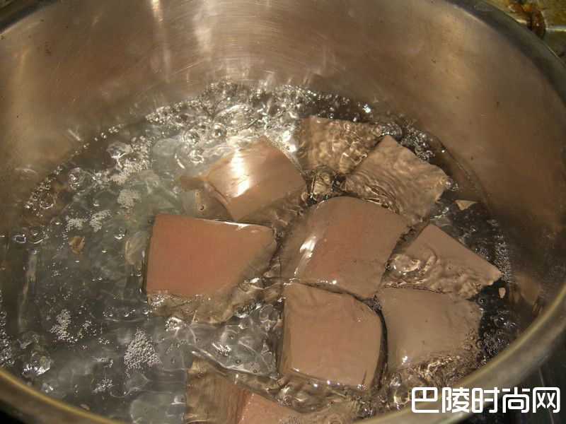 2步骤2将鸭血清洗一下后切大块 , 煮一锅水滚后将鸭血入锅川烫一 立刻起锅 , 放凉