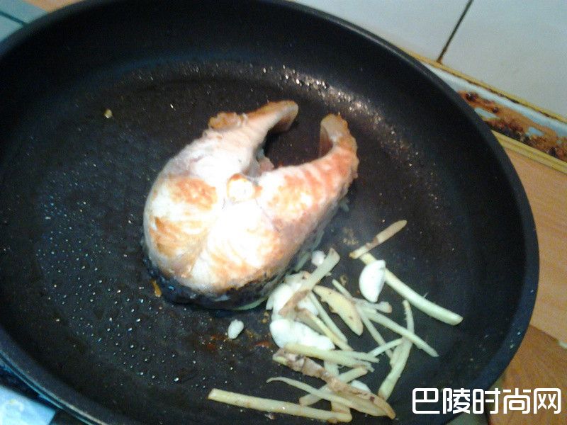 5锅中放入草鱼,煎至两面变色变熟后放入姜丝和蒜头下去爆香。