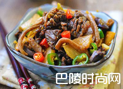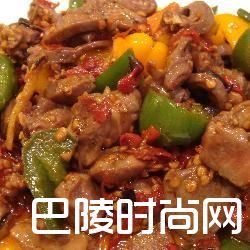 3.再将炒锅置于中火上,放油烧至六成油温,放入花椒和姜片炒出香味,再放入尖椒段炒香炒辣,加鸡胗、鸡心、胡椒粉、精盐略炒,再放鸡肝一起翻炒几下,熟后铲出装盘即成。