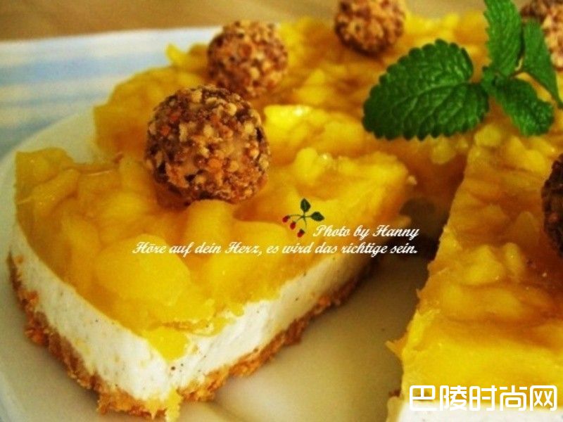 6在芒果层上做喜欢的装饰! 耶~大热天来一块冰凉凉的芒果奶酪蛋糕,好幸福唷~开动!!! ♫♪