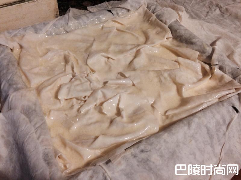 4拿出第二张Yufka铺在第一张上面,可是先上下有皱褶地铺上去,然后刷上蛋奶汁,有皱褶的地方也要翻开刷到,然后将左右两边多出来的部分,也折进来,也是铺上蛋奶汁,注意尽量多弄些皱褶,这样才会一层一层的,而且每层都要有蛋奶汁,这个是这种博瑞克好不好吃,有没有层次分明的关键所在。最上面也是倒上蛋奶汁,刷开。