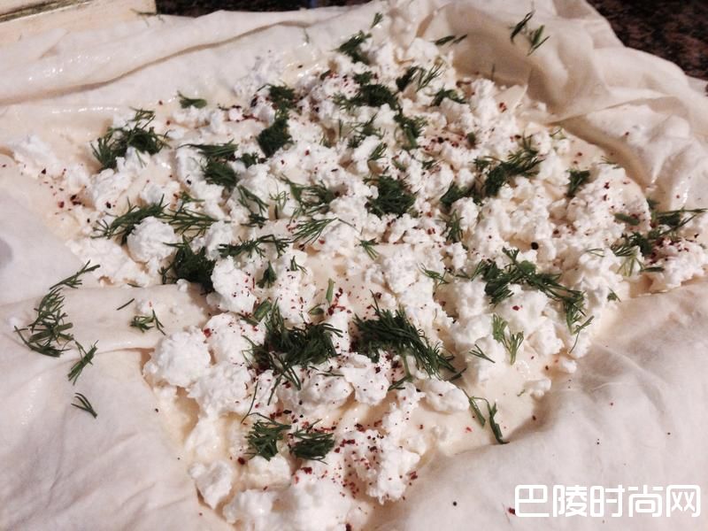 5拿出第三张Yufka,像第一张一样,稍稍有点皱褶,四边都要有多的面皮,倒上少量蛋奶汁以后,撒上碎的白奶酪,莳萝及辣椒粉如图,然后将第三张多出的Yufka包起来,也是倒上蛋奶汁,最后将第一张多出的Yufka也是包起来。都要弄皱面皮。