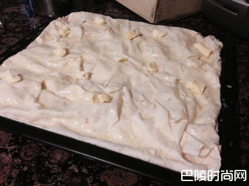 6上面倒上最后剩下的蛋奶汁如图,用手按压整个博瑞克,让每个部分都粘到蛋奶汁,最后上面放上奶油B,把奶油切成小丁,放在上面如图,最好静置半个小时到1个小时,让Yufka充分地吸收蛋奶汁,这样烤出来更层次分明。