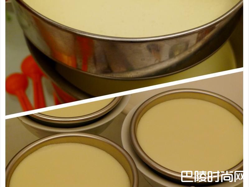 6将奶酪液以筛网过滤进另一搅拌盆使奶酪液更为滑顺,再将滤过的奶酪液倒入圆形模具至9分满,放进冰箱冷藏约30分钟左右使其表面凝固