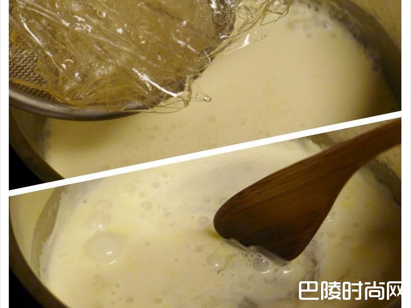 3取一小锅,倒入100ml鲜奶油,煮至温热后熄火加入事先以冰水泡软沥干的吉利丁,一边搅拌至吉利丁完全融化为止,稍微放凉