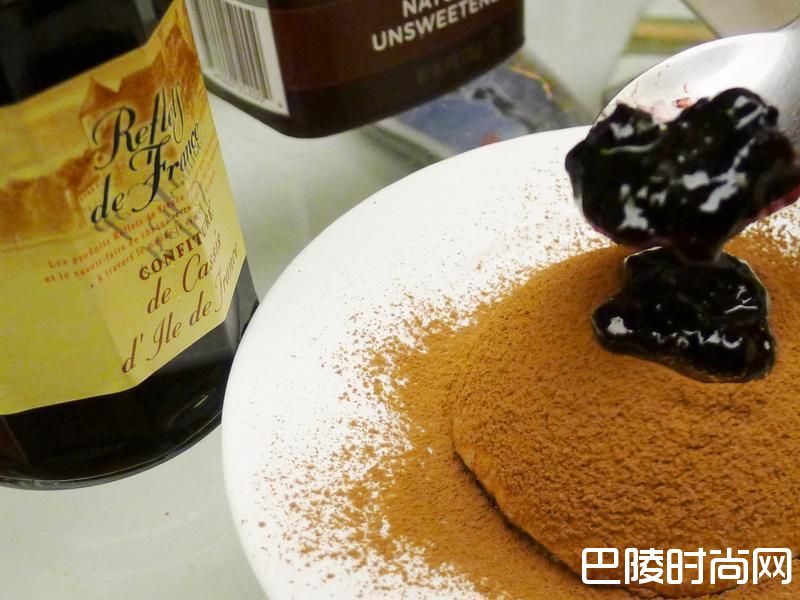 12表层洒些许可可粉,顶端淋上法国Reflets de France黑醋栗果酱,或步骤7的黑巧克力糊