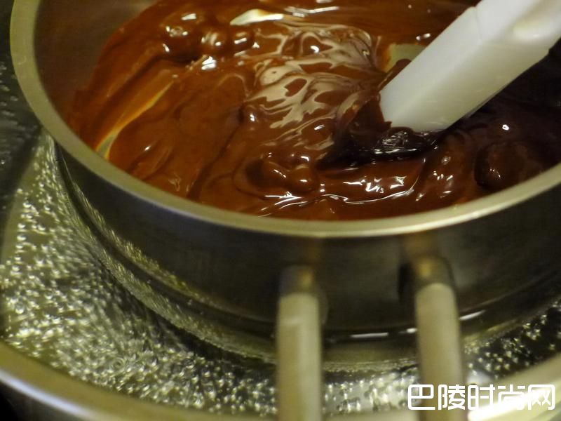 7制作巧克力底座,将黑巧克力切碎(或苦甜巧克力碎粒)一边隔水加热一边搅拌至完全融化