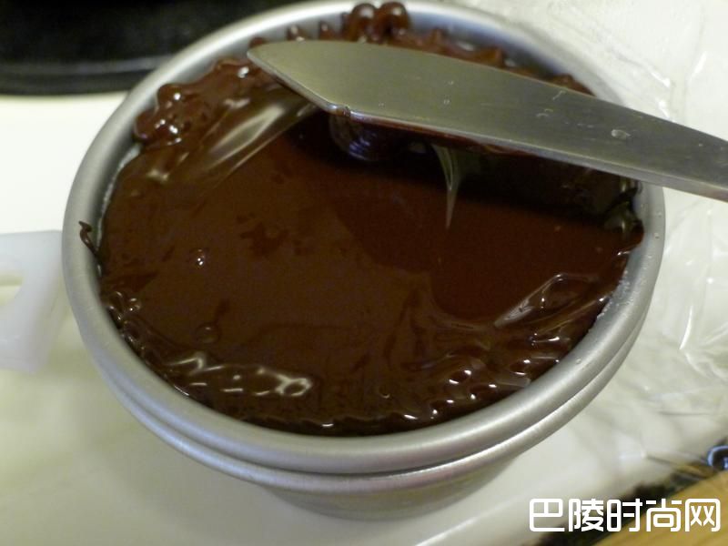 8取出步骤6的奶酪,将步骤7的巧克力糊舀进圆形模具里以抹刀抹平填满,包上保鲜膜放入冰箱冷藏约3小时凝固完全(剩余巧克力糊留着后面可做装饰用)