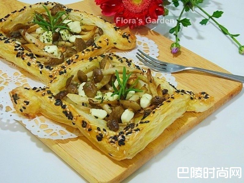 5叠好的派皮在重叠处刷上蛋液、撒上芝麻。将炒好的鸿喜菇、奶油奶酪丁放在中间,烤箱预热210度烤约12分钟。