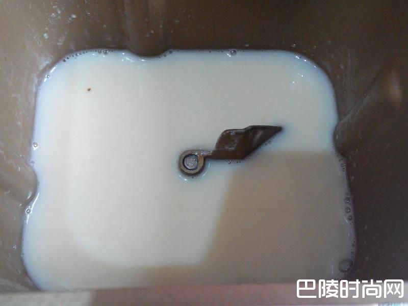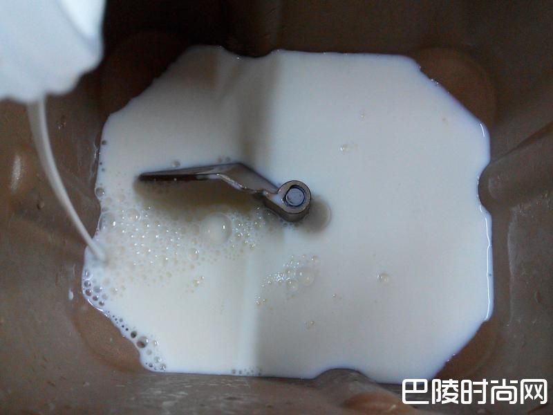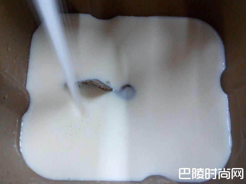 2面包桶装上搅拌叶片,将鲜奶倒入面包桶中。