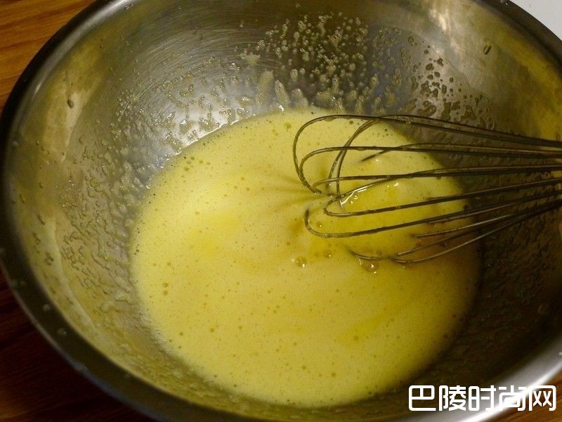 1取一搅拌盆,将蛋打入并以打蛋器搅拌均匀,加入糖、盐继续搅拌至糖、盐溶解完全